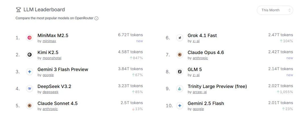 3月6日,OpenRouter平台月度榜单。